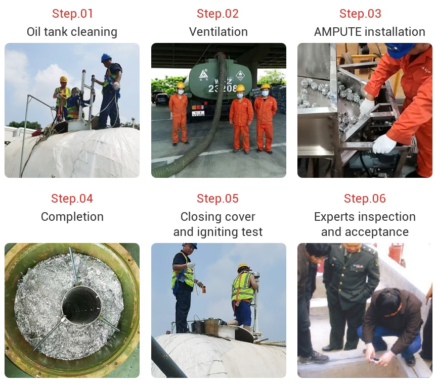 Oil tank cleaning → Ventilation → AMPUTE installation → Completion → Closing cover and igniting test → Experts inspection and acceptance